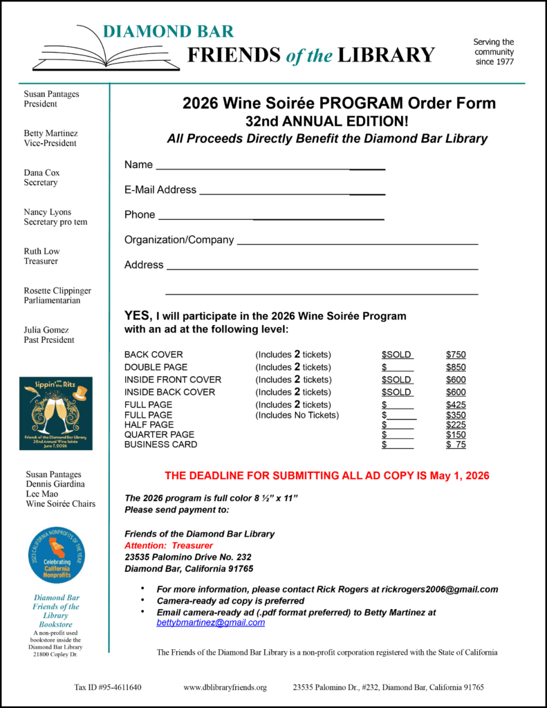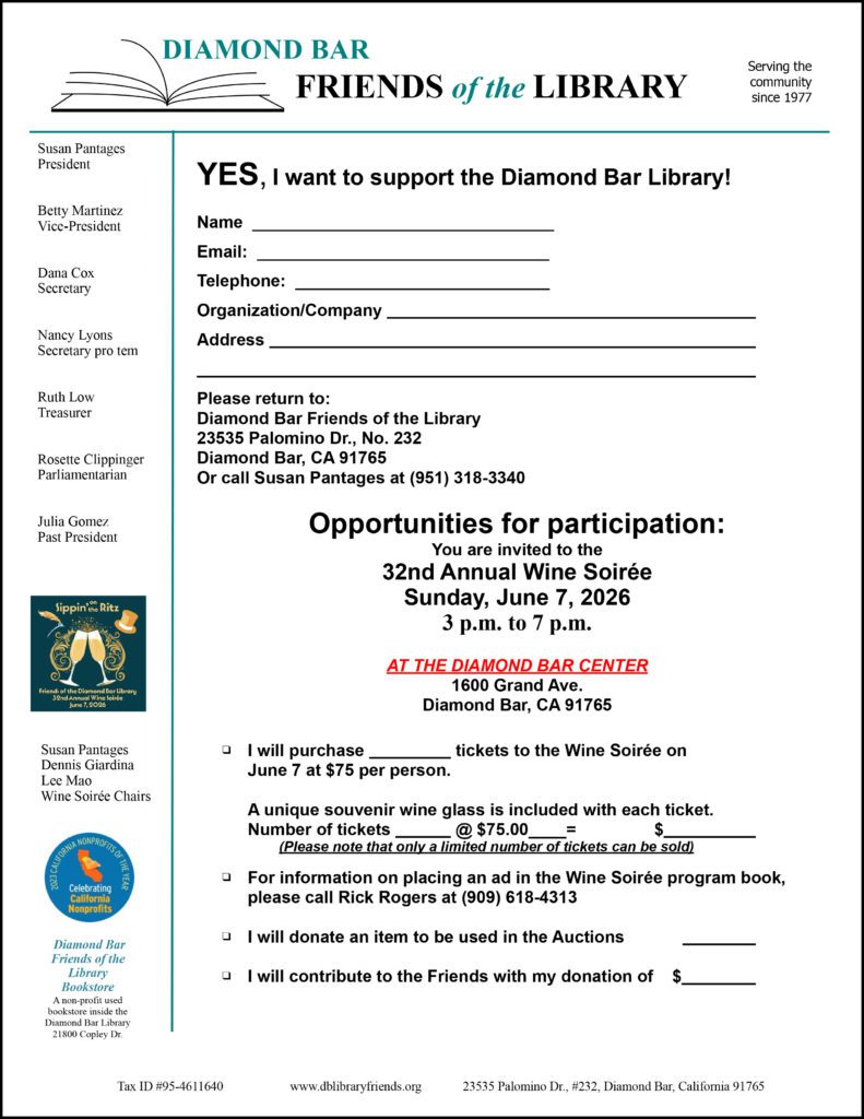 The Diamond Bar Friends of the Library is happy to announce our 32nd annual Wine Soireé scheduled for Sunday, June 7, 2026, 3-7 PM, inside the Diamond Bar Center! This is a wonderful event to enjoy food, wine tasting, live, silent and book auctions, a raffle, music, and reconnecting with friends. Our Wine Soireé is attended by community leaders and residents of Diamond Bar and surrounding cities.